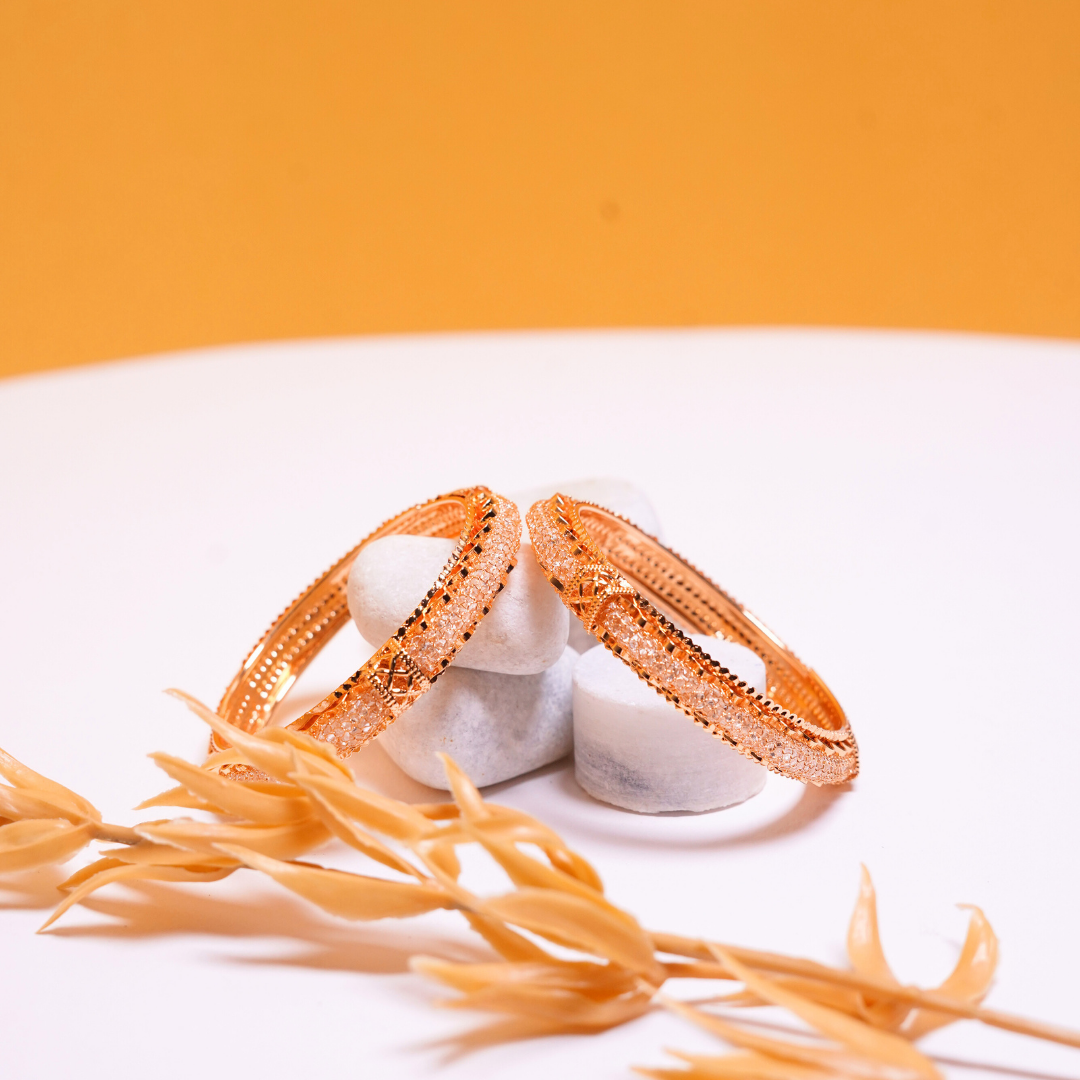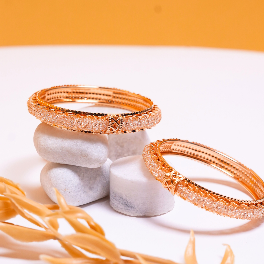 A stunning pair of rose-gold bangles featuring a fully embellished zircon design that shines from every angle.