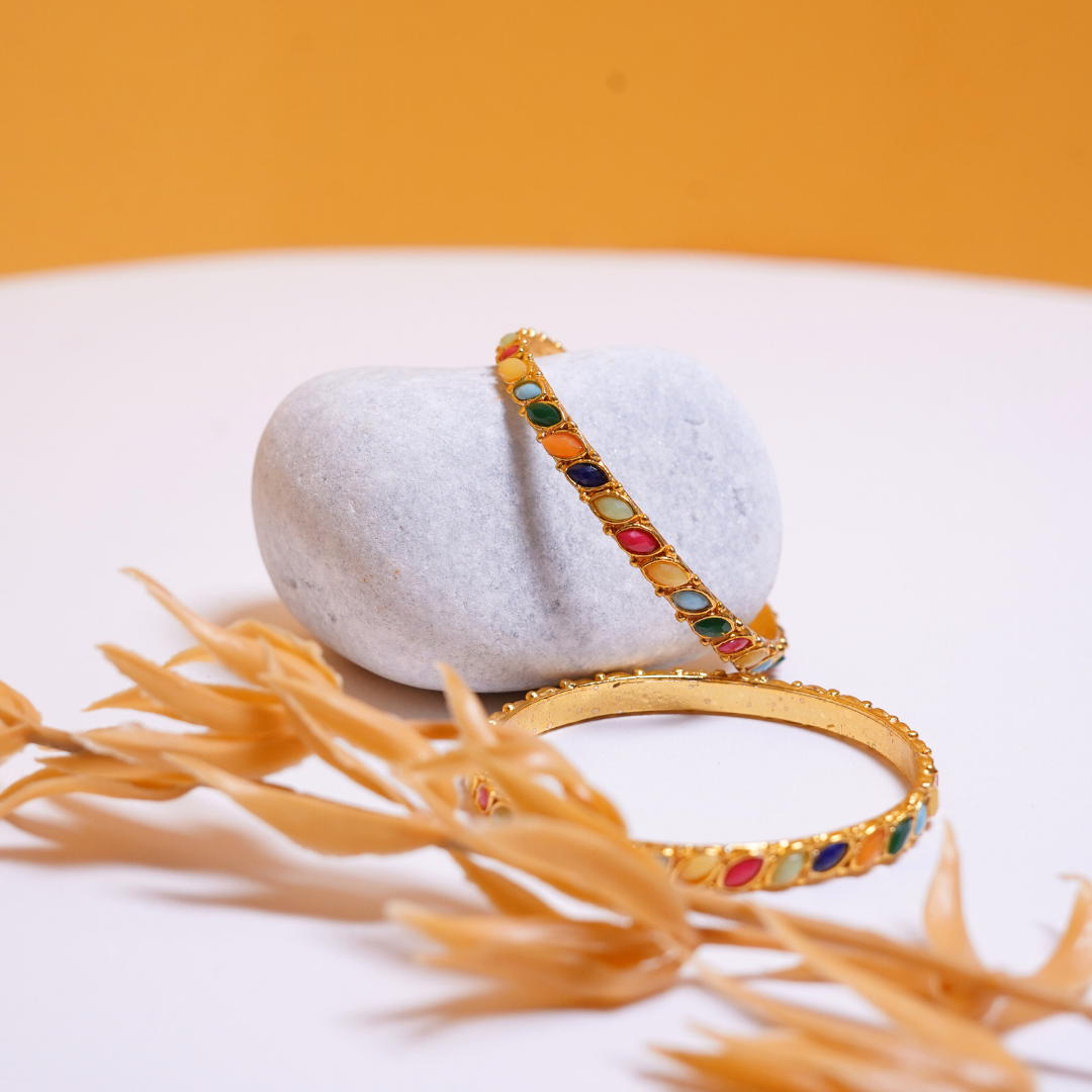 A vibrant bangle set adorned with polished multicolor stones on a sleek gold-plated frame.