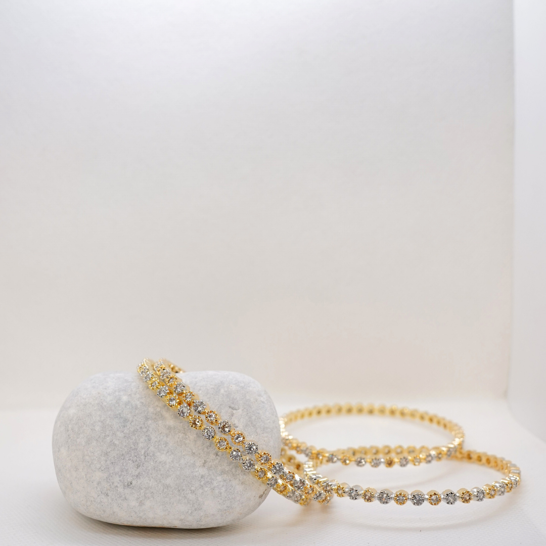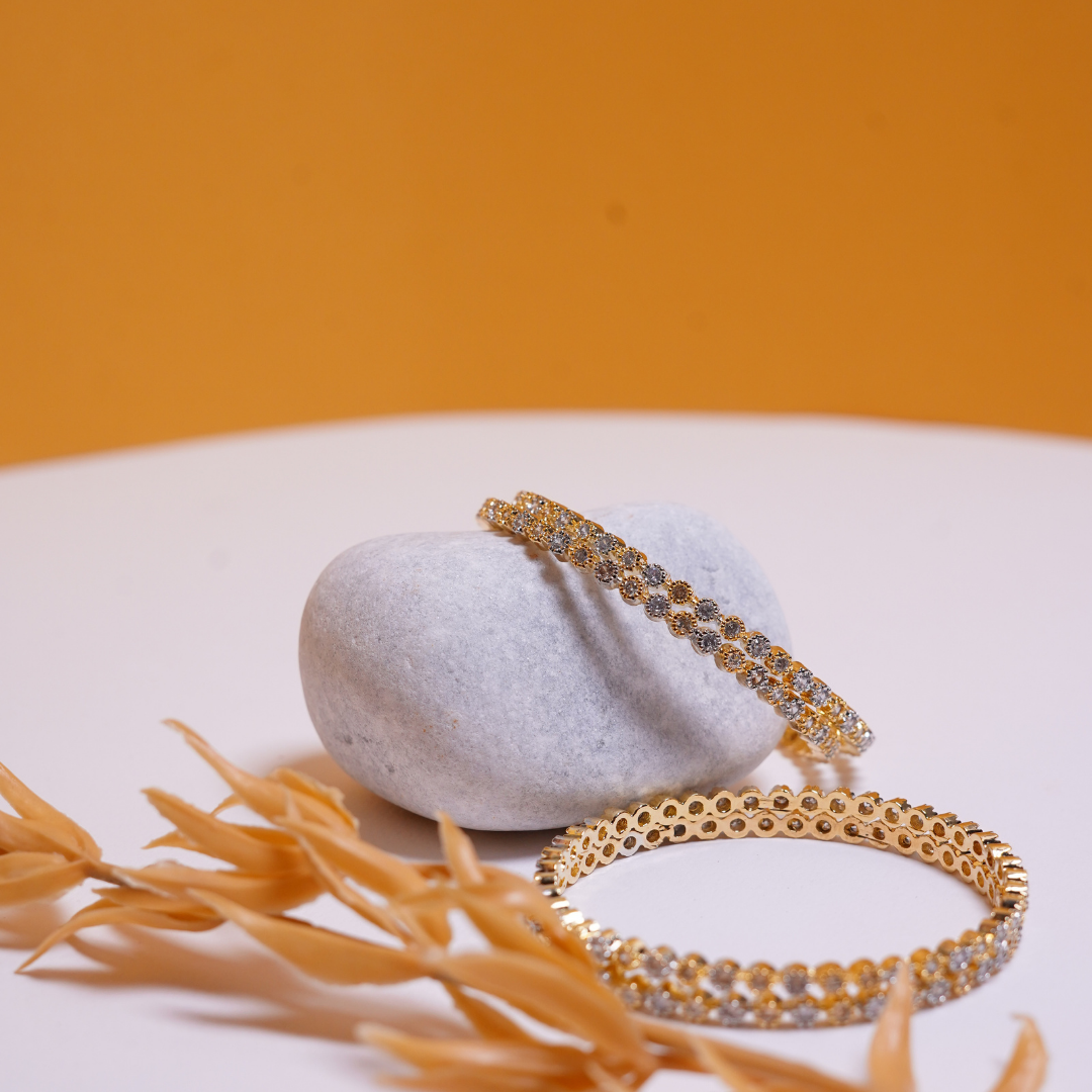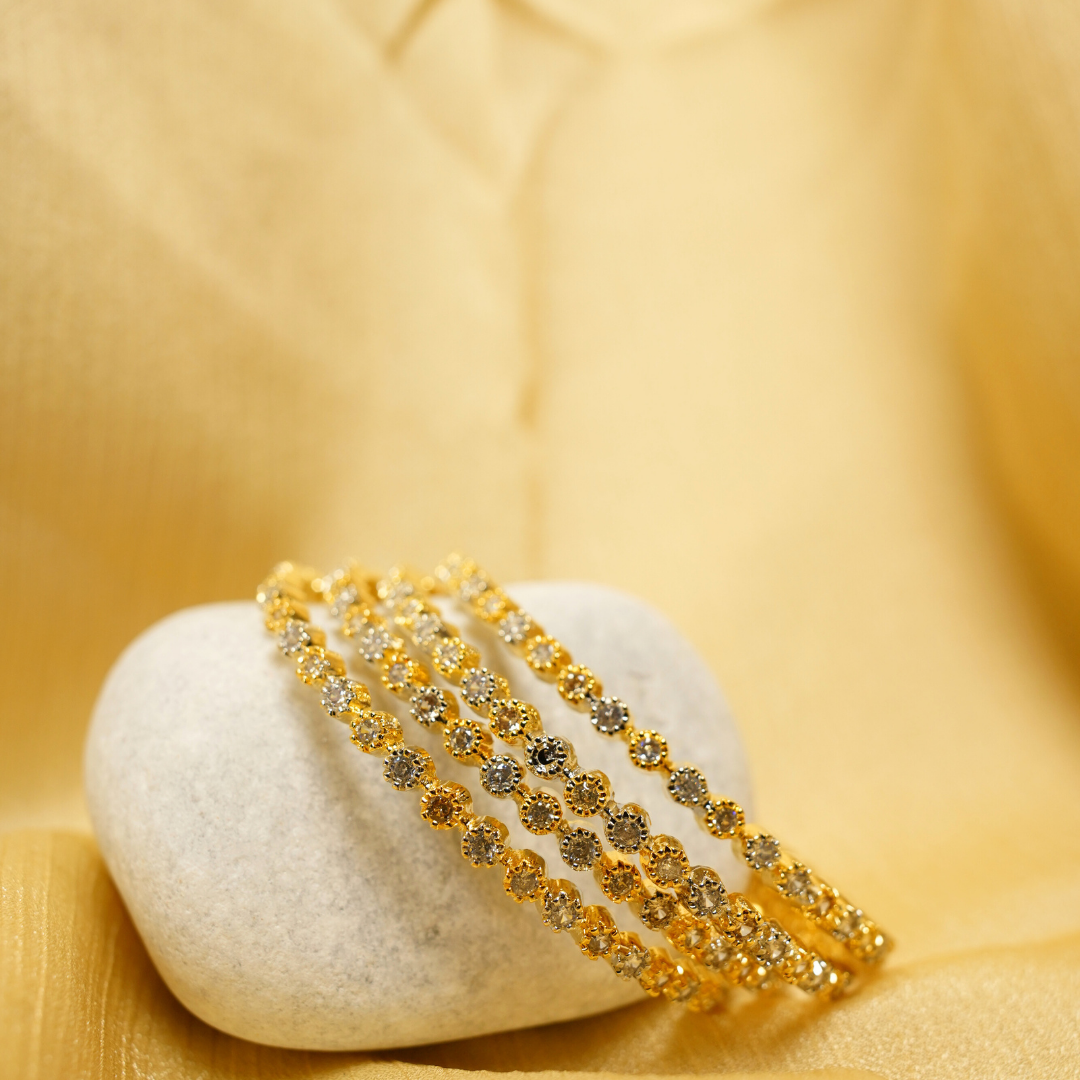 Elegant silver–golden bangles with crystal-like shine and a premium handcrafted look.
