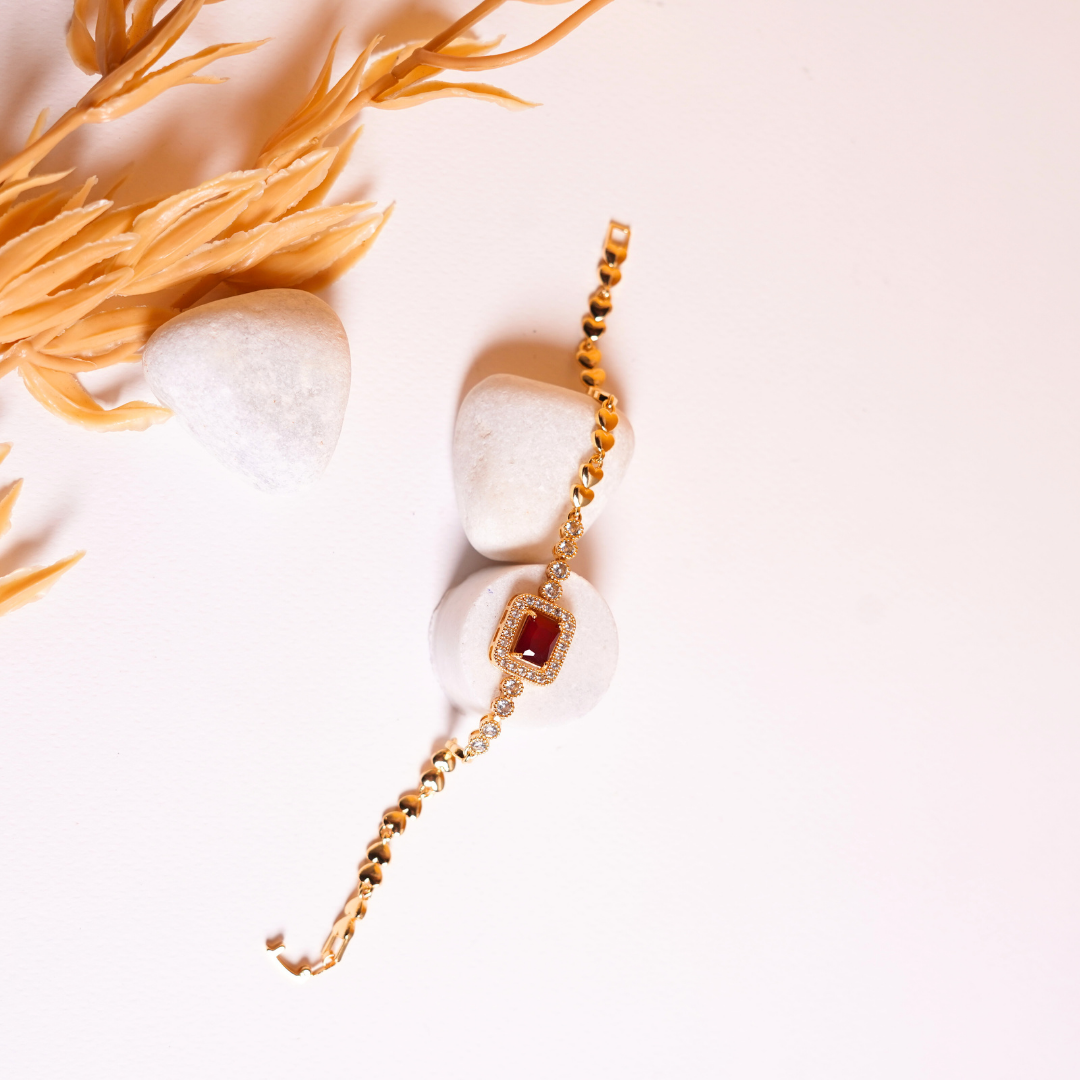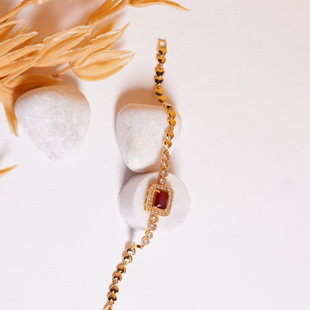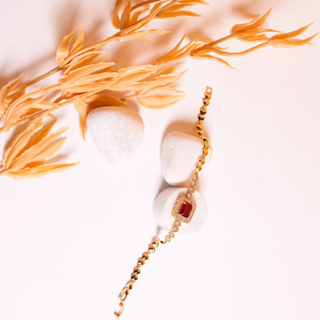 A luxurious gold-plated bracelet featuring a bold ruby-red square stone framed with shimmering crystals.