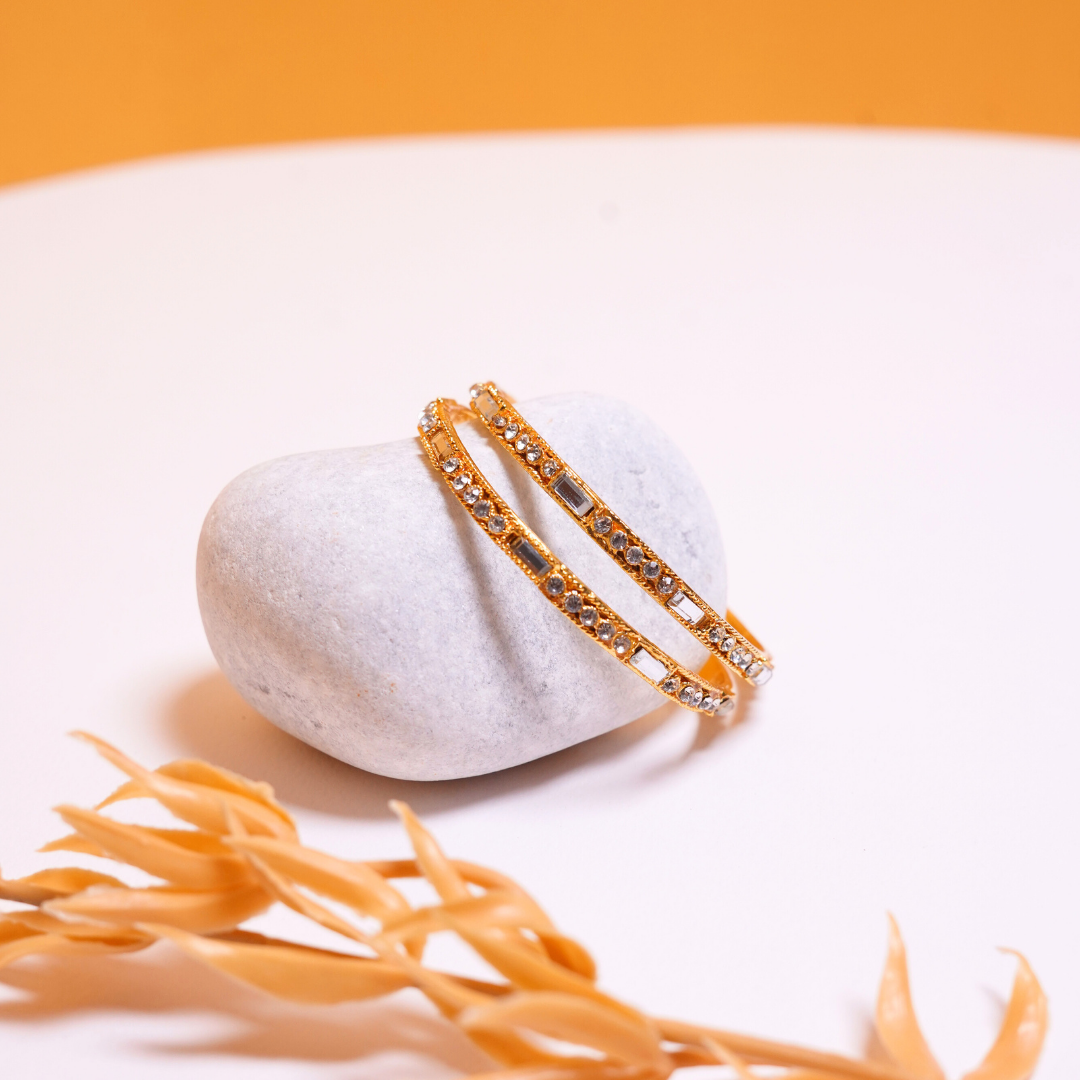 Elegant slim bangles featuring delicate mirror accents paired with fine stone detailing on a gold-plated frame.